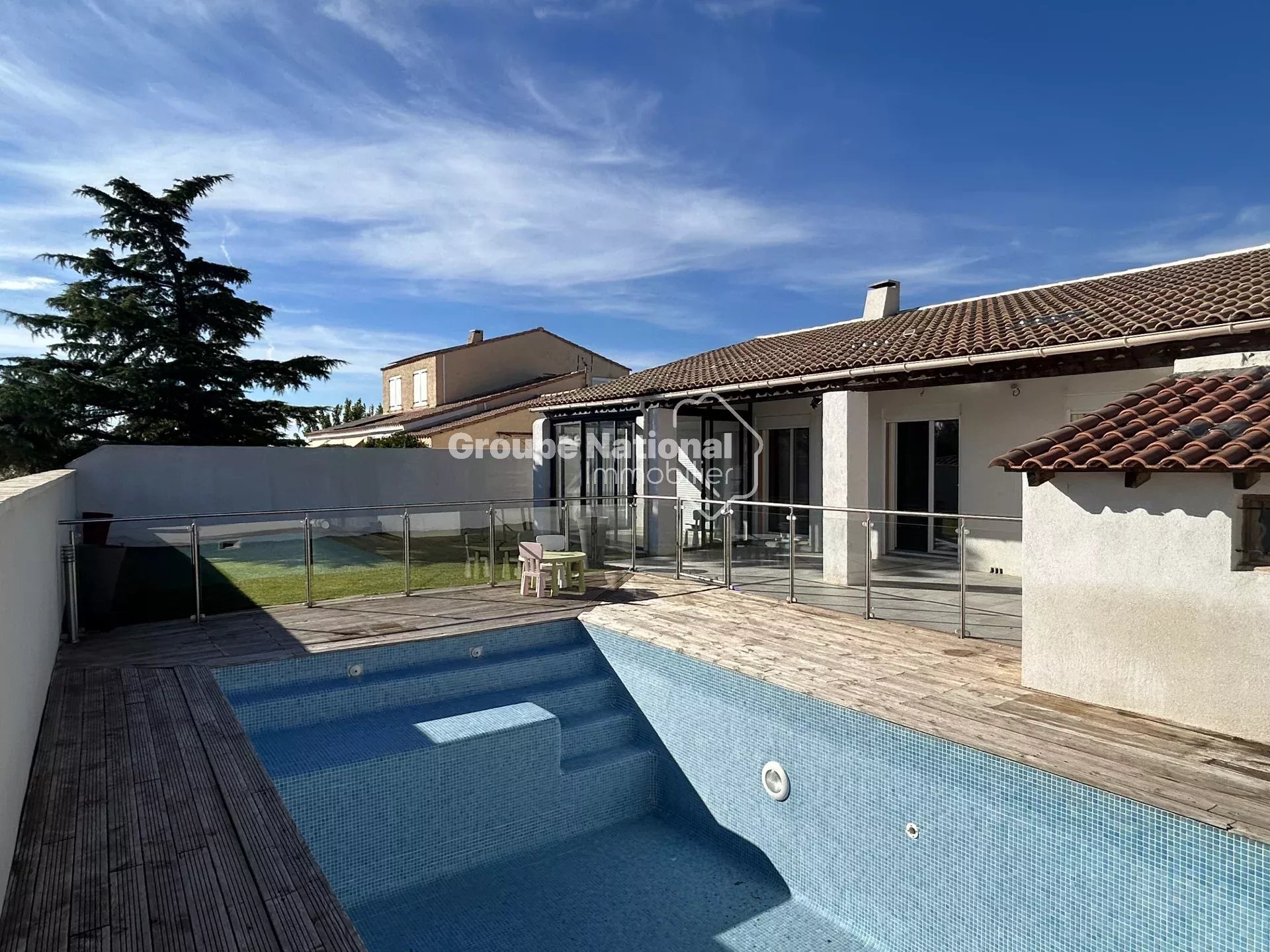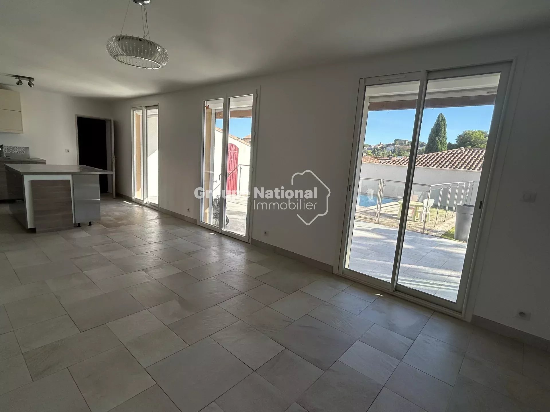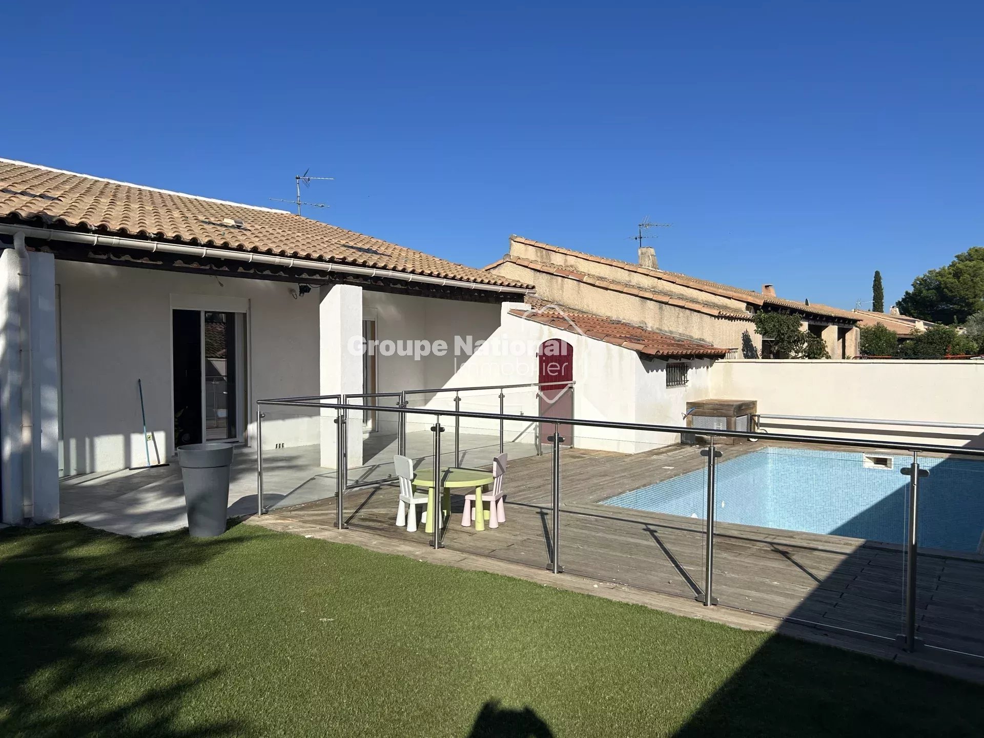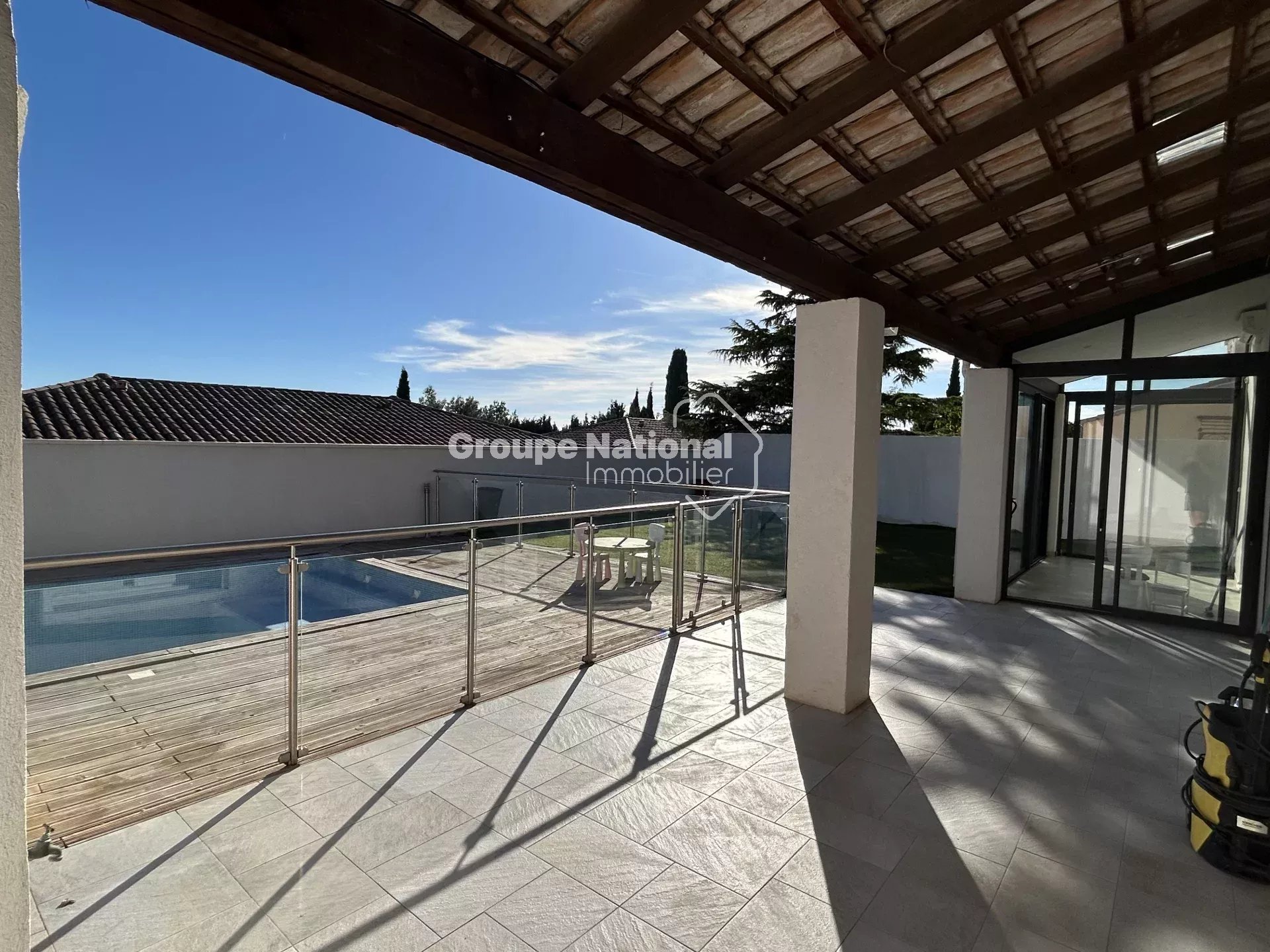 Exposée plein Sud donnant sur une terrasse couverte, piscine chauffée et sécurisée avec vue sur le château de Lançon.